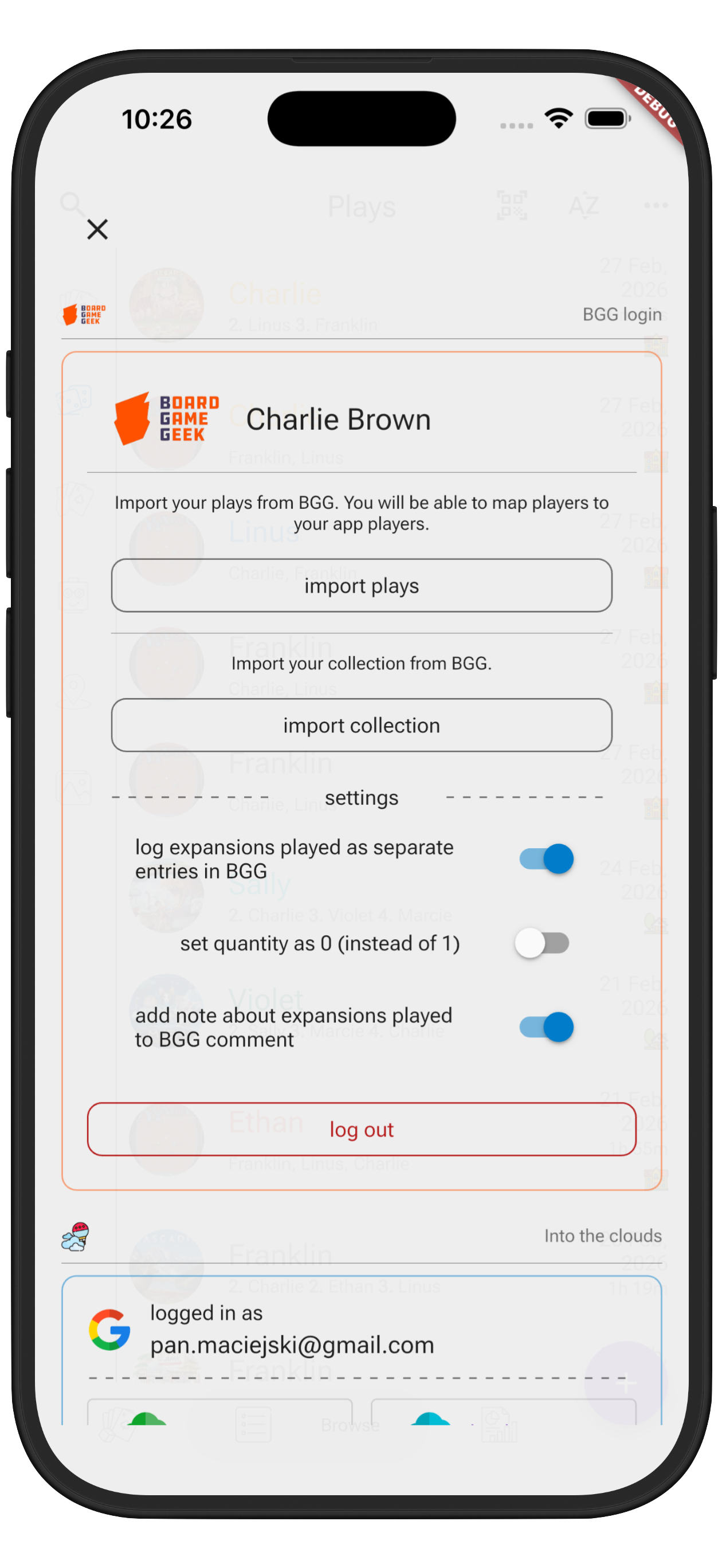 Import your collection and log plays directly to BoardGameGeek from the app.